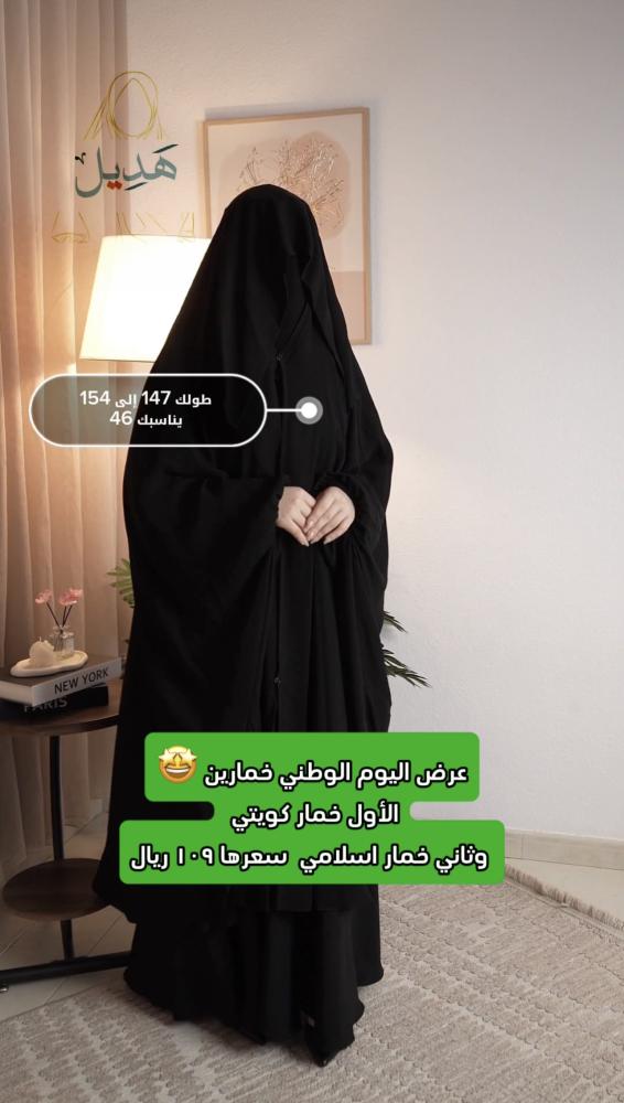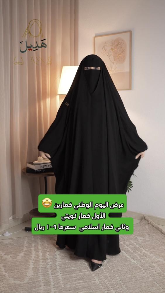 الخمار والنقاب باللون الأسود الكلاسيكي المحتشم، مما يمنح الخمار مظهرًا كلاسيكيًا وأنيقًا.