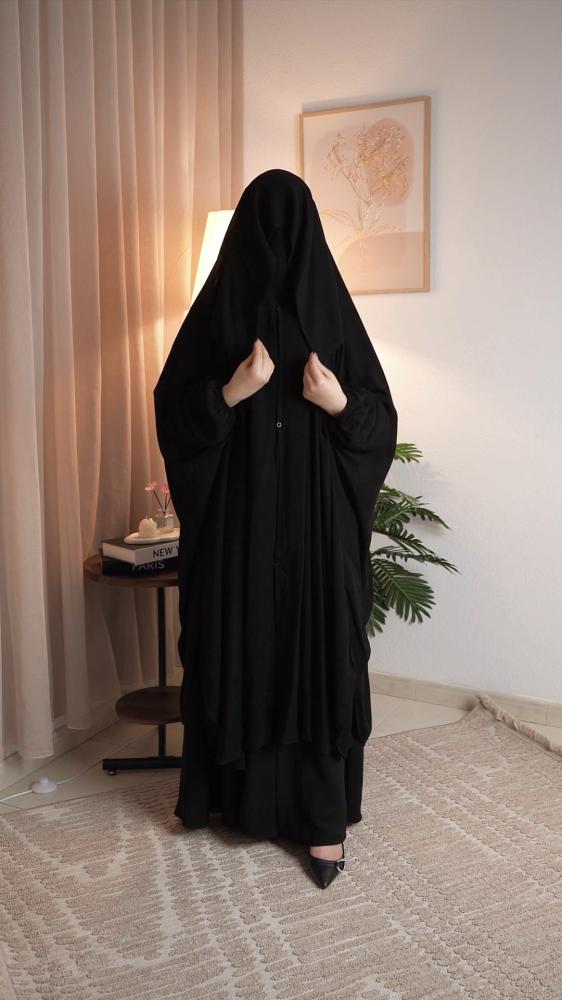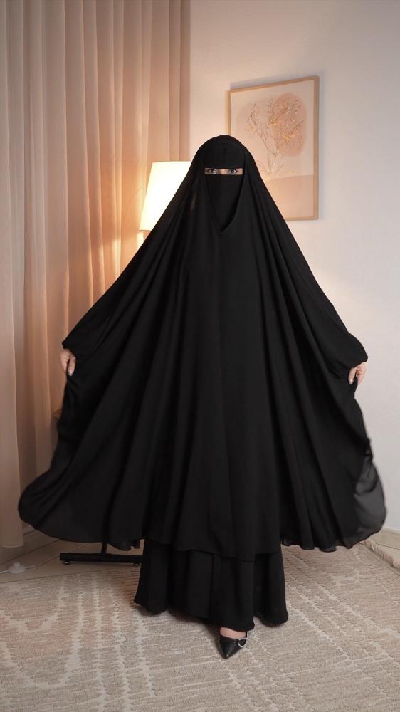 الخمار والنقاب باللون الأسود الكلاسيكي المحتشم، مما يمنح الخمار مظهرًا كلاسيكيًا وأنيقًا.
